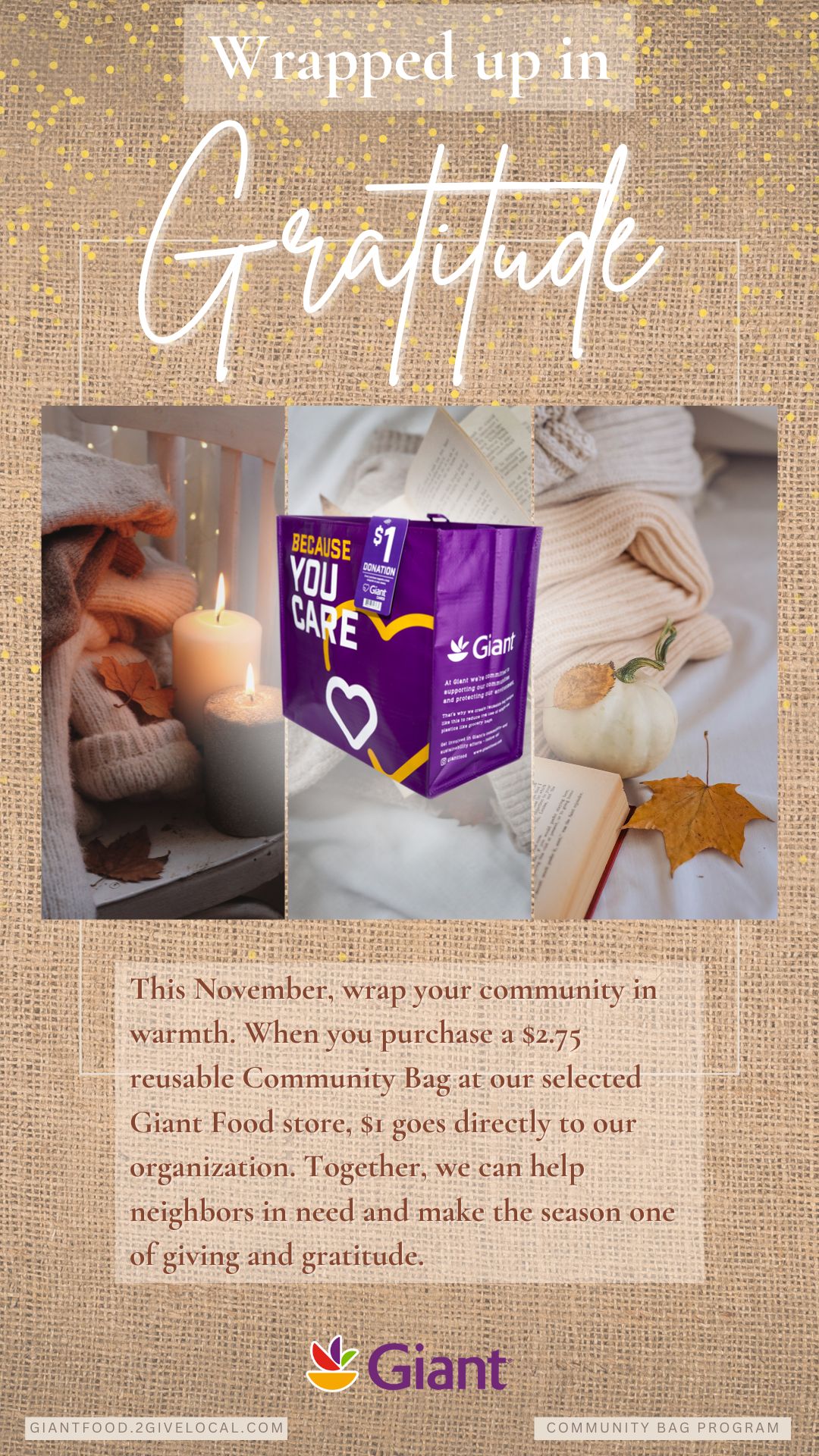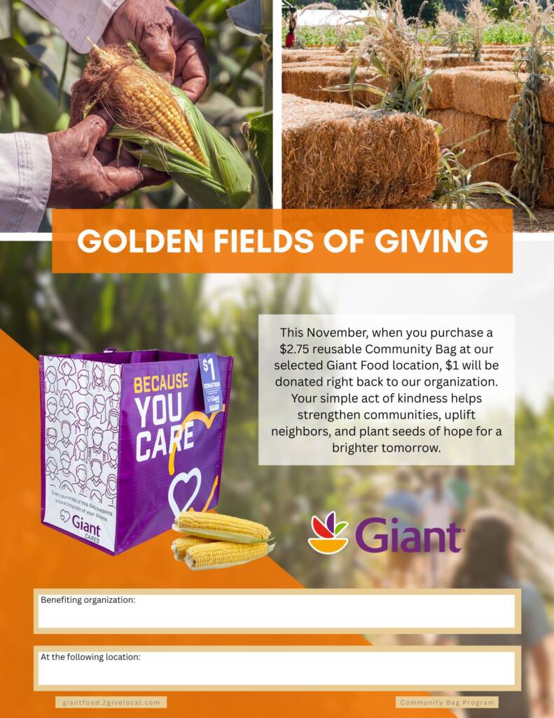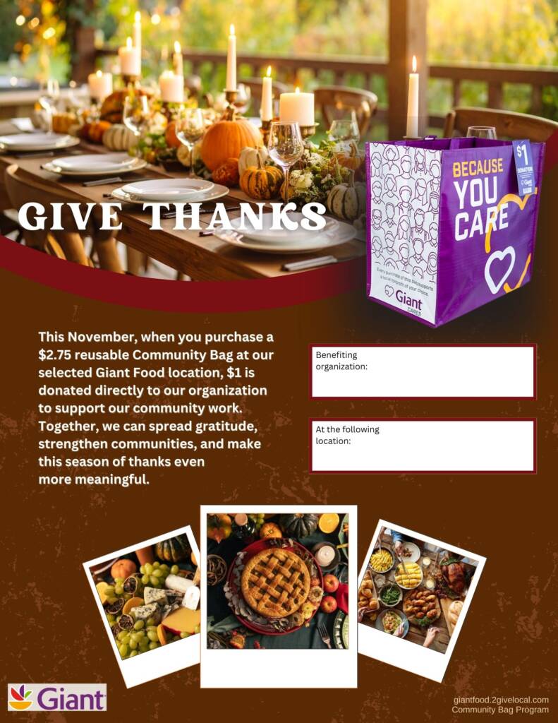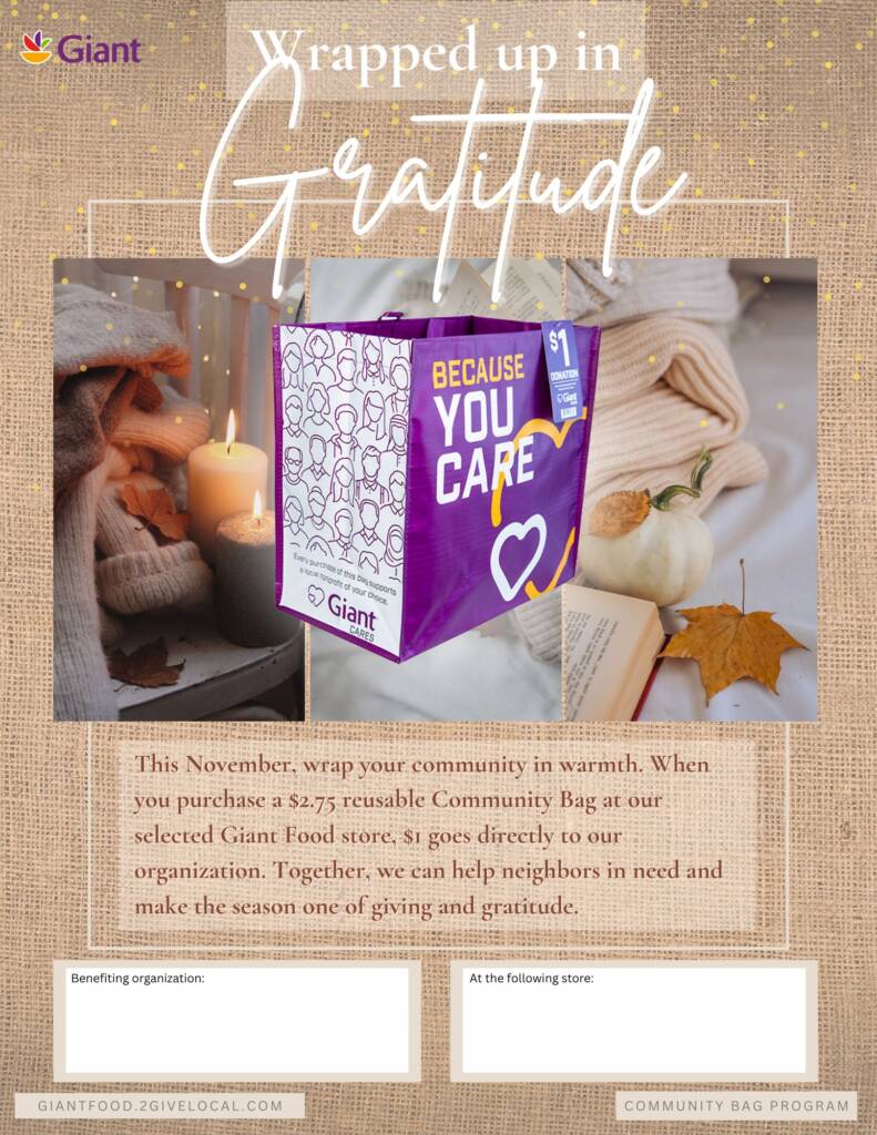 Reach new supporters by putting up flyers around your community! Add your organization’s name and selected Giant Food by inserting a text box directly on the downloaded tool. Or simply download, print, and write in the spaces provided. The more flyers you put around town, the more people will come to support your organization!